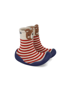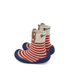 La chaussette montante présente un motif rayé rouge et écru (crème/blanc cassé) pour un style classique et joyeux, avec un motif ludique de petit ours/animal brodé ou tissé dans le haut. Le tissu est conçu pour être doux et respirant, assurant le confort du pied de bébé.