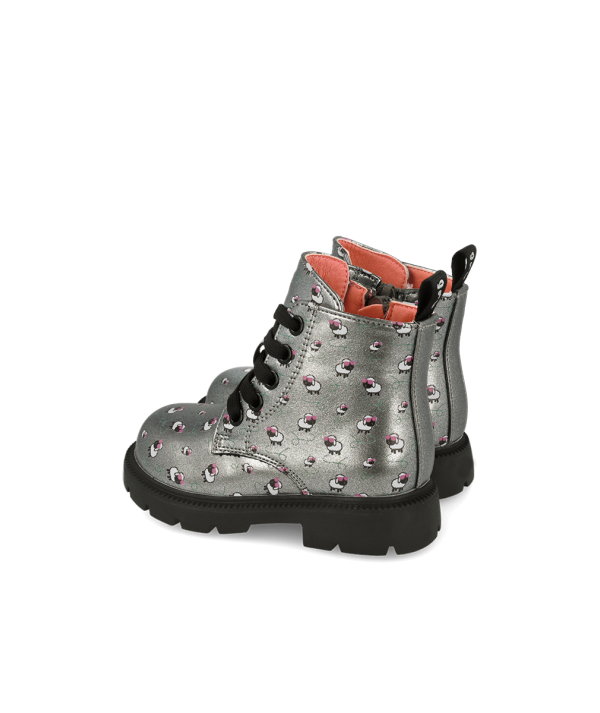 Ces bottines montantes pour enfant de style combat (Rangers) sont à la fois robustes et pleines de fantaisie. Elles sont confectionnées dans un similicuir métallisé argenté très original, orné d'un motif imprimé de petits moutons blancs et noirs avec des détails roses, reliés par des fils de laine verts. La coupe montante assure un excellent maintien de la cheville pour l'enfant.